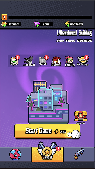 This mobile game blends cyberpunk style with casual strategy elements. Its vibrant pixel art and neon colors create a futuristic urban atmosphere with a sense of technology and mystery. Starting in an abandoned building, players assume the role of an adventurer, exploring the ruins of a city filled with unknowns and challenging themselves through numerous levels. The game offers a rich feature set, including sign-in rewards, holiday events, a quest system, character costumes, hero development, and VIP privileges, catering to players' diverse needs for growth, collection, and social interaction. The bottom navigation bar provides quick access to maps, battles, and weapons. The core gameplay revolves around strategic planning and fast-paced combat. Players must strategically combine character skills and exploit terrain to defeat enemies within a time limit and advance the story.